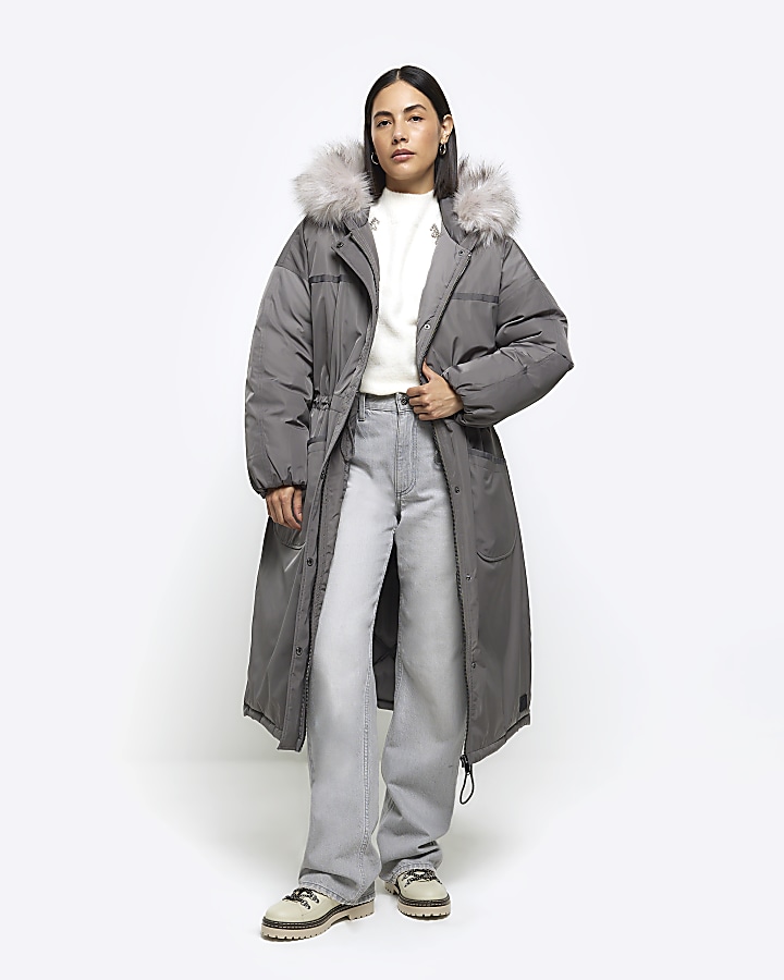 Product id: Grey faux fur top trim longline puffer jacket